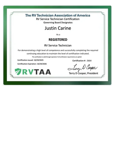 Hello! I'm Justin Carine, a Certified RV Inspector and Registered RV Technician. I received my certifications through the NRVTA (National RV Training Academy), which is the only RV Training School accredited by the NRVIA (National RV Inspectors Association) and RVTAA (RV Technicians Association of America).