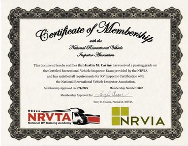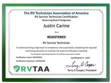 Hello! I'm Justin Carine, a Certified RV Inspector and Registered RV Technician. I received my certifications through the NRVTA (National RV Training Academy), which is the only RV Training School accredited by the NRVIA (National RV Inspectors Association) and RVTAA (RV Technicians Association of America).